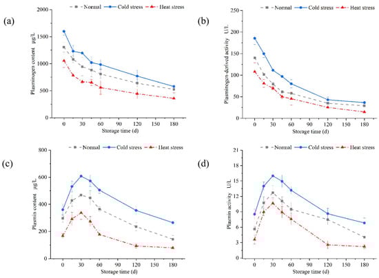 Changes in the components of the plasmin system during the storage of UHT milk at 25 °C. (a) Plasminogen content, (b) plasminogen activity, (c) plasmin content, and (d) plasmin activity. Data are presented as mean ± SD of triplicates.