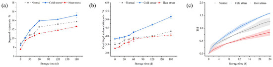 Hydrolysis of plasmin and its impact on the stability of UHT milk. (a) Changes in hydrolysis degree and (b) centrifugal sedimentation rate of UHT milk during storage under different stress conditions. (c) Kinetic instability index (TSI) of UHT milk under different stress conditions. The value of the detection error is indicated by the range of extension around the connecting line. Data are presented as mean ± SD of triplicates.