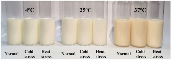 The milk’s color variation was assessed using a colorimeter, which computed ΔE based on the recorded L*, a*, and b* values. The ΔE value quantified the color variation in UHT milk following storage under various temperature conditions. Fresh cow’s milk is a white opaque emulsion [49], with its hue primarily determined by the fat content [50]. Table 1 suggests that the color difference values of cold-stressed milk were significantly greater (p < 0.05) across all three storage temperature conditions, with a ΔE of 14.54 at 37 °C. The higher milk fat content in cold-stressed milk, along with the higher plasmin activity that hydrolyzed milk fat globule membrane proteins, resulted in lipoglobulin aggregation, thereby intensifying the impact on the milk color [51]. Moreover, elevated storage temperatures prolonged the Maillard reaction, resulting in an increased ΔE value of the milk [52]. A more intuitive display of color variations, Figure 5 illustrates the actual outcomes of the three distinct strained milks during storage at 37 °C.