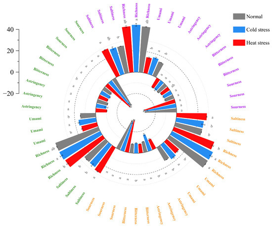 The characterization of flavor alterations in milk was performed by the electronic tongue, where varying potential values were associated with distinct taste profiles. As shown in Figure 6, under the storage condition of 4 °C, the relative umami and richness of cold-stressed milk were more significant (p < 0.05). Under the storage condition of 25 °C, the relative bitterness, umami, and richness of cold-stressed milk were more significant (p < 0.05). Under the storage condition of 37 °C, the relative bitterness, astringency, umami, and richness of cold-stressed milk were more significant (p < 0.05). For hot-stressed milk, it was the saltiness that was more significant at all three storage temperatures. Bitterness in UHT milk is associated with protein degradation [2,53]. The peptides formed by the hydrolysis of proteins by plasmin contain many bitter peptides, which are mainly derived from αS1 casein and αS2 casein. In addition, acetic acid and furfural generated by the Maillard reaction are also associated with bitterness [54], and the intermediates of lipid oxidation are also involved in the Maillard reaction and promote non-enzymatic browning, producing more furfural [55]. The bitterness and astringency of cold-stressed milk in the figure can be attributed to the high protein, fat, and lactose content of cold-stressed milk, as well as more intense hydrolysis by plasmin [56].