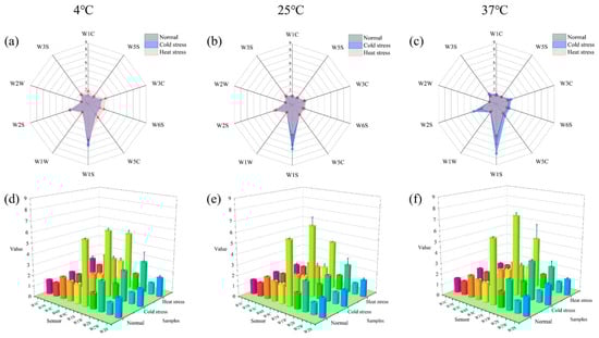 Radar charts and 3D bar charts illustrate the classes of odorants in milk, specifically the odorants of UHT milk subjected to various stress situations in different storage environments. (a) Odor distribution radar plots of three conditions of milk under storage condition at 4 °C. (b) Odor distribution radar plots of three conditions of milk under storage condition at 25 °C. (c) Odor distribution radar plots of three conditions of milk under storage condition at 37 °C. (d) Histogram of the odor distribution of the three conditions of milk under storage condition at 4 °C. (e) Histogram of the odor distribution of the three conditions of milk under storage condition at 25 °C. (f) Histogram of the odor distribution of the three conditions of milk under storage condition at 37 °C.