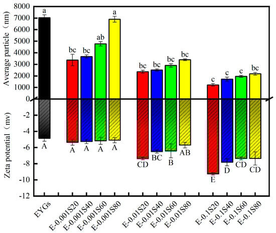Average particle size and zeta potential of EYGs-Span emulsifiers with different compounding concentrations. Different letters indicate significant differences (p < 0.05) in the mean values within the same parameter group.