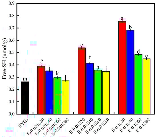 Free sulfhydryl content of EYGs-Span emulsifiers with different compounding concentrations. Different letters indicate significant differences (p < 0.05) in the mean values within the same parameter group.