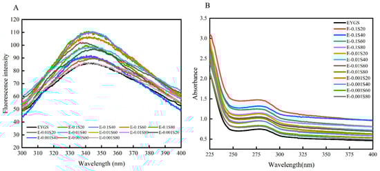Fluorescence spectra (A) and UV spectra (B) of EYGs-Span emulsifiers with different compounding concentrations.