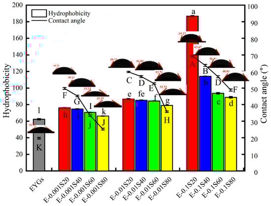 Contact angle and surface hydrophobicity of EYGs-Span composite systems with different compounding concentrations. Different letters indicate significant differences (p < 0.05) in the mean values within the same parameter group.