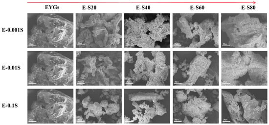 The sample’s microstructure, including its three-dimensional structure and spatial arrangement, was observed through SEM []. The structural changes in the freeze-dried EYGs-Span complex were further illustrated in the SEM images shown in Figure 6. With increasing emulsifier concentration, the fragments of the EYGs-Span complex became smaller and less cohesive compared to the large aggregates in natural EYGs. The structural changes followed this order: Span 20 < Span 40 < Span 60 < Span 80, although Span 80 showed only a minimal effect on the EYGs. This observation is consistent with the variation in the average particle size described in Section 3.1, confirming the hypothesis that the EYG structure becomes looser upon emulsifier addition.