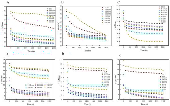 Dynamic interfacial tension versus time at the air/water and oil/water (bottom) interfaces for EYGs-Span emulsifier and Span emulsifier with different compounding concentrations ((A,a) is 0.001 concentration, (B,b) is 0.01 concentration, and (C,c) is 0.1 concentration).