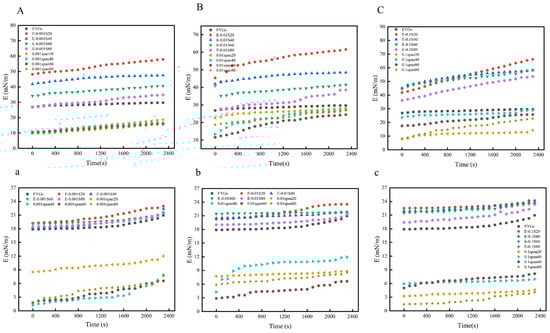Composite expansion modulus with time for the EYGs-Span emulsifier and Span emulsifier at the air/water and oil/water (bottom) interfaces with different compounding concentrations ((A,a) is 0.001 concentration, (B,b) is 0.01 concentration, and (C,c) is 0.1 concentration).