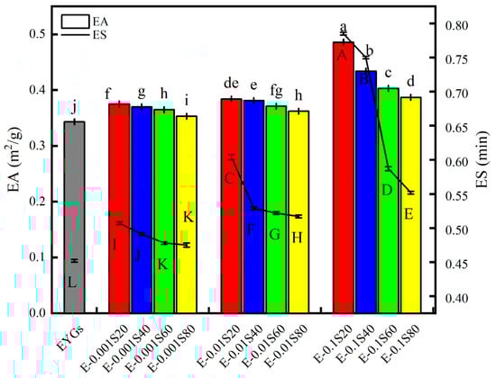 Emulsifying activity refers to the ability to rapidly adsorb onto the surface of oil droplets and facilitate the formation of small droplets during homogenization. Conversely, the stability index measures the emulsion’s resistance to aggregation and phase separation. Compared to the natural EYGs (EA 0.343 m2/g, ES 0.452 min), both EA and ES of the EYGs-Span systems increased slightly with increasing emulsifier concentration in the following order: Span 20 > Span 40 > Span 60 > Span 80 (Figure 9). This indicates that the presence of Span emulsifiers boosted the emulsifying activity of the EYGs. Notably, E-0.1S20 exhibited the highest emulsifying activity and stability, which can be attributed to the Span 20’s low molecular weight (346 Da) and minimal steric hindrance. This allowed for more efficient interface adsorption without displacing the proteins []. These findings are consistent with those of [], who reported superior emulsion properties when sodium caseinate was combined with a low-molecular-weight emulsifier, Tween 20, compared to sodium caseinate alone. Furthermore, the dissociation of EYGs may reduce their particle size and release components, such as HDL, which could further augment emulsification [].