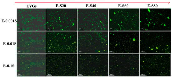 Emulsions, which are small oil droplets dispersed in an aqueous medium, are thermodynamically unstable systems. They are prone to phase separation, flocculation, coalescence, and separation due to gravity. Figure 10 presents the stability of agglomeration in freshly prepared emulsions under an inverted fluorescence microscope. The size and distribution of EYGs significantly improved after being combined with Span emulsifiers, with the following order of effectiveness: Span 20 > Span 40 > Span 60 > Span 80. The effect was more pronounced with increasing concentration, which corresponded with the emulsification results presented in Figure 11. These findings were agreed with the particle size distribution analysis.