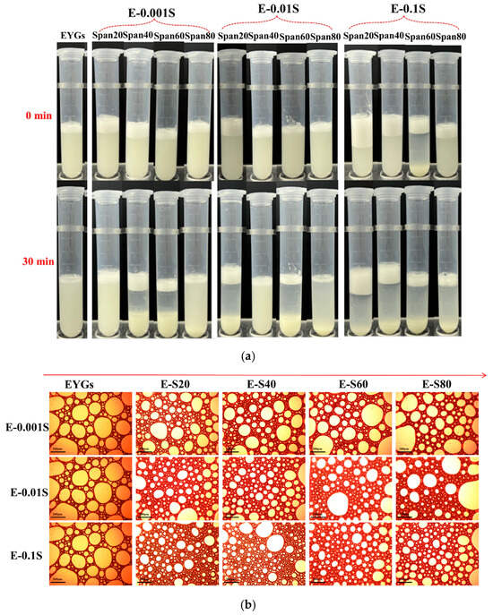 The microstructure of the EYGs-Span system emulsions was observed using an inverted fluorescence microscope (IX73, Axiolab A, Nankoku City, Japan) following [] with a few modifications. In total, 10 µL of the emulsion was applied to a slide, covered with a glass slide cover, and photographed under a 40× objective.