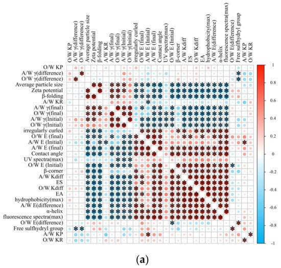 Figure 12a presents a heat map for the correlation analysis of the interfacial properties, emulsification characteristics, and protein structural properties of the EYGs-Span composite system. The correlation analysis highlighted significant relationships among interfacial properties, emulsification performance, and protein structural characteristics. Smaller particle sizes are closely linked to higher ES and greater interfacial elasticity, indicating that finer particles contribute to more stable emulsions. The absolute value of zeta potential was positively correlated with both diffusion (Kdiff) and penetration rates (Kp), suggesting that stronger electrostatic repulsion improves molecular mobility at the interface. Additionally, EA and ES were positively correlated with the expansion modulus, emphasizing the importance of interfacial elasticity in effective emulsification. Notably, more disordered protein structures, such as irregularly curled conformations, are associated with lower contact angles, indicating improved wettability. Furthermore, the positive correlations between UV and fluorescence spectral maxima and EA suggested that structural rearrangements facilitate augmented emulsification efficiency. These findings illustrate the complex interplay between particle size, interfacial behavior, and protein structure in influencing the stability and functionality of emulsions.