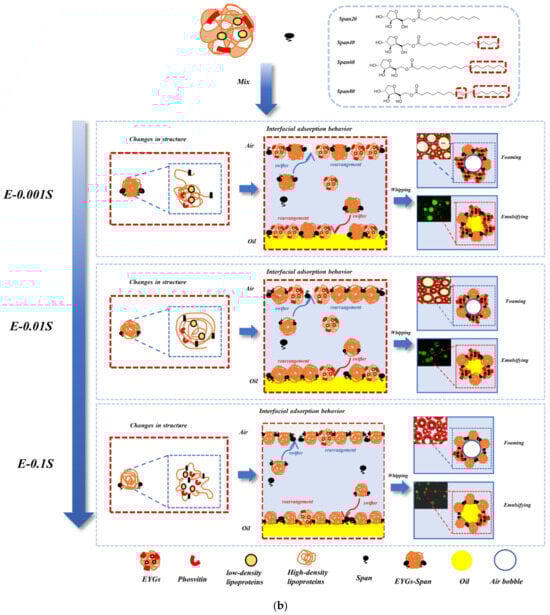 Egg yolk granules (EYGs) primarily comprise high-density lipoproteins (HDLs, 70%), phosvitin (16%), and low-density lipoproteins (LDLs, 12%), interconnected through calcium-phosphorus bridges [,]. These attributes render EYGs ideal as emulsifying agents in a diverse range of products [,], including mayonnaise, baked goods, cream, and ice cream, particularly in the formulation of mayonnaise, thereby catering to the increasing demand for healthier dietary options [,]. However, the compact, calcium-phosphorus bridge structure of EYGs results, reducing emulsification stability in mayonnaise and leads to water-oil separation []. Common methods to enhance EYGs emulsification stability include strong alkali treatment or high NaCl ionic strength, which disrupt the compact structure of EYGs, improving their solubility and emulsifying properties. However, these methods risk inducing EYGs coagulation and denaturation, ultimately lowering their nutritional value []. Therefore, alternative gentler treatment approaches are needed. According to recent studies, combining emulsifying agents with proteins through electrostatic, hydrogen bonding, or hydrophobic interactions can modify protein structure, enhancing emulsification stability comparably to strong bases and high ionic strengths [,]. Additionally, the amphiphilic nature and abundant lipoproteins of EYGs allow them to pair with lipoprotein emulsifiers, which could further improve emulsification stability. Thus, this study examines the combination of Span emulsifiers with EYGs to enhance structural and interfacial properties, aiming to improve emulsification and foaming stability while broadening the application potential.