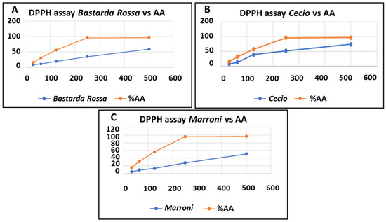 DPPH assay. Absorbance decrease in three cultivar extracts analyzed compared to control, ascorbic acid (AA). Antioxidant activity (expressed as %AA) of chestnut varieties was measured at varying extract concentrations (0–500 µg/mL). (A–C) represent cultivars Bastarda Rossa, Cecio, and Marroni, respectively.