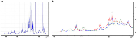 (A) The 1H NMR spectrum of an aqueous extract. (B) The aromatic region of the spectrum shows signals of gallic acid (*) and ellagic acid (+) for the cultivar Bastarda Rossa (RB, blue), Cecio (RC, red), and Marroni (RM, green). Signal integration allowed for polyphenol quantification, reported in Table 5.