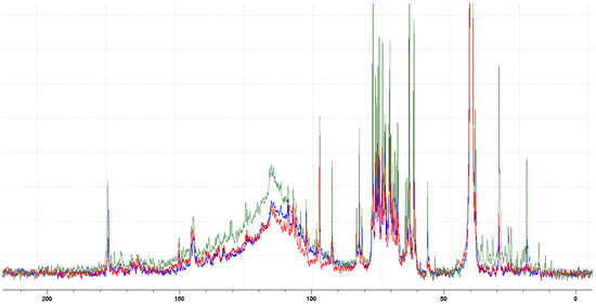 13C NMR normalized spectra of Bastarda Rossa (RB, blue), Cecio (RC, red), and Marroni (RM, green).