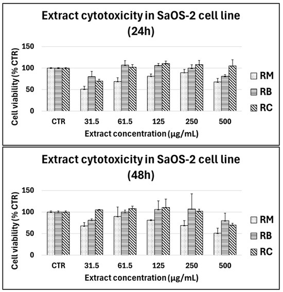 Cytotoxicity of chestnut extracts (RM: Marroni, RB: Bastarda Rossa, RC: Cecio) on SaOS-2 cells at varying concentrations (31.5–500 µg/mL) after 24 h (top panel) and 48 h (bottom panel) of treatment. Cell viability was measured using the MTT assay, and the results are expressed as a percentage of the untreated control group (CTR). Extract concentrations ranged from 31.5 to 500 µg/mL, with bars representing the mean ± standard deviation from three independent experiments.