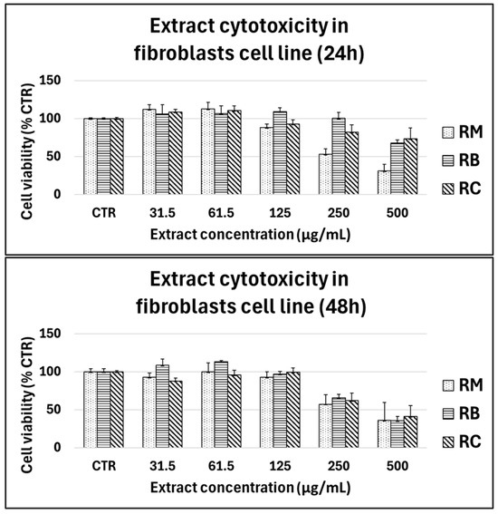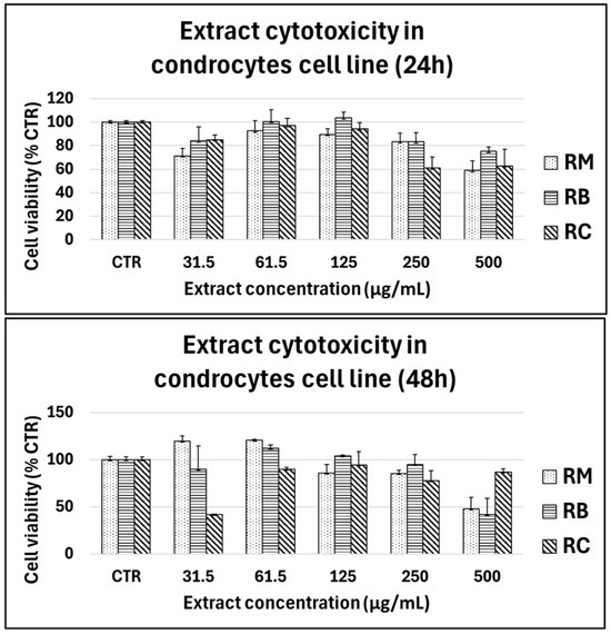 Cytotoxicity of chestnut extracts (RM: Marroni, RB: Bastarda Rossa, RC: Cecio) on chondrocyte varying concentrations (31.5–500 µg/mL) after 24 h (top panel) and 48 h (bottom panel) of treatment. Cell viability was measured using the MTT assay, and the results are expressed as a percentage of the untreated control group (CTR). Extract concentrations ranged from 31.5 to 500 µg/mL, with bars representing the mean ± standard deviation from three independent experiments.