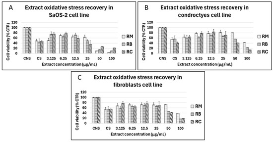 RC showed the highest concentration of bioactive compounds such as gallic acid, ellagic acid, and flavonoids, and consequently, its potential application in the nutraceutical field. RM, with a milder profile of these molecules due to selective breeding, appeared more suited for food consumption, aligning well with evolving consumer behavior toward functional foods [22,23,24]. Then, the three cultivars’ extracts were assessed for cytotoxicity and protection from oxidative stress in three different cell lines: SaOS-2, fibroblasts, and chondrocytes. Although a slight variation in the cell model viability response used in this study was noted upon treatment with the three cultivar extracts, none of the considered extracts yielded a toxic effect in the cultured cells in a wide range of concentrations. The variations in cellular responses to the extracts could be attributed to the distinct biological characteristics of each cell type. SaOS-2 cells, an osteosarcoma cell line, are typically more sensitive to oxidative stress and reactive oxygen species (ROS) due to their heightened metabolic activity. As shown in several studies, osteosarcoma cells can exhibit significant reductions in viability when exposed to high concentrations of plant extracts that induce oxidative damage [68]. Fibroblasts, on the other hand, tend to be more resilient to oxidative stress. They have evolved efficient antioxidant defense mechanisms, allowing them to better tolerate prolonged exposure to potentially harmful compounds. Studies have demonstrated that fibroblasts can endure higher concentrations of bioactive compounds without a drastic decrease in cell viability [69]. Chondrocytes exhibit slower metabolic activity and lower antioxidant capacities, making them more vulnerable to oxidative stress. This characteristic makes chondrocytes more sensitive to prolonged exposure to high concentrations of plant extracts, as evidenced by similar findings in other studies on cartilage cells [70]. These inherent differences in cellular resilience to oxidative stress and metabolic activity explain the observed differential responses in cell viability across the different cell types used in this study upon treatment with the chestnut extract. In regards to the cytoprotective activity, the Cecio and Bastarda Rossa extracts demonstrated strong cytoprotective effects against H2O2-induced oxidative stress in all cell lines, likely due to their elevated levels of gallic acid, ellagic acid, and flavonoids, which may modulate oxidative stress pathways or stimulate cellular repair mechanisms (as shown by cell viability percentages compared to the untreated controls). According to the literature body, all these bioactive compounds display well-documented protective activities against oxidative stress [19], underlining the prospects of chestnut byproducts to support food waste, adding value through innovative applications in food sustainability and nutraceuticals.