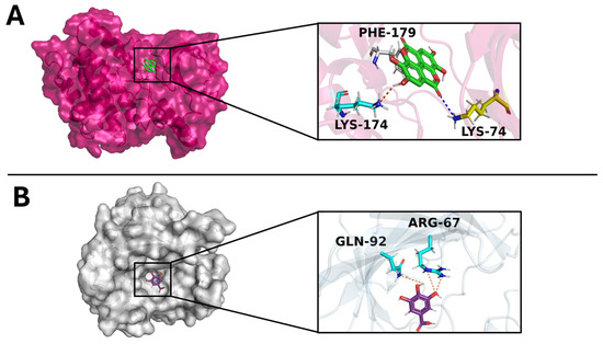 Docking simulations were then performed to further unravel the interactions between ellagic and gallic acid with their respective targets as described in our previous works [5,7]. For greater consistency in docking results, the exhaustiveness was adjusted from 8 to 32 and only binding poses with an RMSD within 2 Å of the optimal docked pose were accepted; all other parameters were kept as default. The 3D structures of gallic acid and ellagic acid were obtained from the PubChem database [44,45], with compound IDs 370 and 5281855, respectively, and downloaded in SDF format. A box was configured around the residues previously shown to be involved in interactions with their inhibitors using DockingPie2.0 [46] integrated into PyMOL 3.0, with AutoDock Tools v.4.2 [36,47].