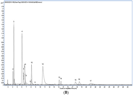 Extracted ion chromatogram of major polyphenol compounds detected in the coffee cherry pulp extract. (A): compounds detected after operation in the positive ion mode. (B): compounds detected after operation in the negative ion mode.
