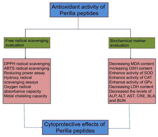 Represents antioxidant activity of perilla peptides leads cytoprotective effect through metal chelation, free radical scavenging, and in vivo assays. (Figure created using Biorender.com).