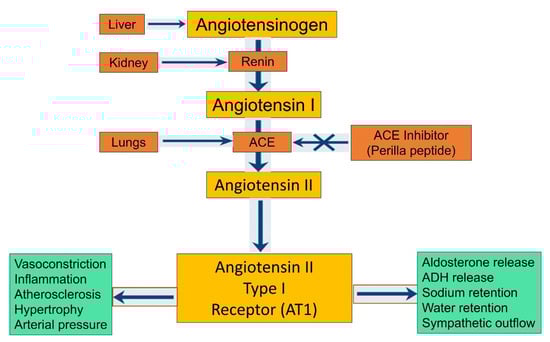 The inhibition of angiotensin I-converting enzyme (ACE) serves as a crucial indicator for evaluating the antihypertensive properties of biological components. ACE is a central enzyme in the renin–angiotensin system (RAS) that regulates blood pressure and fluid balance in the body [58]. By converting angiotensin I to the potent vasoconstrictor angiotensin II, ACE directly influences vascular resistance and blood pressure. Therefore, inhibiting ACE can effectively lower blood pressure by preventing the formation of angiotensin II, reducing vasoconstriction, and promoting vasodilation. This mechanism is the basis for many antihypertensive drugs, highlighting the therapeutic significance of ACE inhibitors (Figure 3). ACE inhibitory peptides derived from natural sources are particularly promising, as they may offer effective and safer therapeutic options with fewer side effects compared to conventional ACE inhibitors [59,60]. Park and Yoon et al., (2019) [14,20] prepared various peptide fractions and protein hydrolysates from PSM using Flavourzyme at pH 7.0 at 50 °C for 4 h and collected various fractions as <1, 1–3, 3–5, 5–10, and >10 kDa fractions. Among the peptide fractions isolated from perilla, the <1 kDa fraction demonstrated the most robust ACE inhibitory activity, while the 5–10 kDa fraction exhibited the least activity. This observation aligns with existing research, which consistently shows that low molecular weight peptides possess more potent ACE-inhibitory activity compared to high molecular weight peptides. Notably, the peptide hydrolysate (PPH), >10 kDa, and 1–3 kDa fractions displayed comparable inhibitory activities, with no significant differences observed among these fractions [14]. In addition to ACE inhibition, these peptides exhibited significant antioxidant activity. This dual functionality further enhances their therapeutic potential. Antioxidants are vital in neutralizing free radicals and reducing oxidative stress, which is implicated in various cardiovascular diseases. Therefore, peptides that can inhibit ACE and exhibit antioxidant properties offer a multifaceted approach to cardiovascular health. Given their dual capabilities in both ACE inhibition and antioxidant activity, perilla-derived peptides hold promise not only as antihypertensive agents but also as beneficial components for overall cardiovascular health. The <1 kDa fraction, in particular, which displayed significant ACE-inhibitory and antioxidant activities, could be considered a particularly promising candidate for further development as a multifunctional therapeutic agent for hypertension and oxidative stress-related conditions. The findings that low molecular weight peptides exhibit stronger ACE-inhibitory activity can be attributed to their ability to interact more effectively with the ACE active site [61,62]. Smaller peptides can fit more easily into the enzyme’s binding pockets, leading to better inhibition. This principle underpins the development of peptide-based ACE inhibitors, which aim to mimic these interactions to achieve therapeutic effects [61,62,63]. The additional antioxidant properties of these peptides further their potential clinical utility. Oxidative stress is a major contributing factor to the development and progression of hypertension and other cardiovascular diseases. By mitigating oxidative stress, these peptides could help protect against endothelial dysfunction, a key event in the pathogenesis of hypertension and atherosclerosis [64,65]. Moreover, the combination of ACE inhibition and antioxidant activity suggests that perilla peptides could provide comprehensive cardiovascular protection. They could lower blood pressure, reduce oxidative damage, and improve endothelial function, thereby addressing multiple aspects of cardiovascular health.