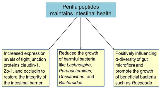 The gut harbors a vast array of microorganisms that significantly impact host nutrition, physiology, immunity, and metabolism [69]. Alterations in these gut microbes and impaired gut barrier function are closely linked to the progression of metabolic diseases. In patients with metabolic diseases, the number and nature of gut microorganisms are often disrupted, and bacterial toxins can exacerbate the disease and its complications [70]. One key indicator of intestinal health is the α-diversity of gut flora, reflecting the stability and robustness of the intestinal environment [71]. Perilla peptides have demonstrated a crucial role in maintaining intestinal health by positively influencing gut microflora and strengthening the gut barrier. They significantly improve the diversity and composition of gut microorganisms, leading to an increase in the α-diversity of the intestinal flora. This enhancement indicates a more stable and healthier gut environment, thereby improving intestinal microecology. Specifically, perilla peptides promote the growth of beneficial bacteria such as Roseburia. Roseburia produces butyrate, a short-chain fatty acid that regulates inflammation, repairs the intestinal epithelial barrier, and protects kidney function [31,72]. Conversely, harmful bacteria like Lachnospira, Parabacteroides, Desulfovibrio, and Bacteroides, which are commonly increased in patients with chronic metabolic diseases, are significantly reduced by perilla peptides. Desulfovibrio, for example, is a pathogen that produces toxic sulfides, disrupts the intestinal barrier, and is linked to lipid metabolism disorders. Similarly, Parabacteroides and Lachnospiraceae are associated with liver damage and the development of obesity and diabetes, respectively. Perilla peptides effectively decrease the abundance of these harmful bacteria, showcasing their regulatory effect on intestinal microorganisms [31,73]. The intestinal epithelium relies on tight junction proteins, such as claudin-1, Zo-1, and occludin, to maintain its barrier function against toxins and pathogens [74]. In conditions like adenine-induced liver and kidney injuries, high ammonia levels disrupt these junctions, leading to increased intestinal permeability and systemic inflammation. Perilla peptides have been shown to increase the expression of claudin-1, Zo-1, and occludin, thereby restoring the integrity of the intestinal barrier and reducing serum endotoxin levels. This restoration is critical for preventing the infiltration of harmful metabolites and reducing pro-inflammatory factors secreted by immune cells [31]. The beneficial effects of perilla peptides can be attributed to their rich amino acid composition, including Asp, Leu, Thr, Tyr, Ser, Phe, Glu, His, Gly, Lys, Ala, Arg, Val, Pro, Met, Cys, and Ile, with an average molecular mass of 760 kDa. These amino acids play vital roles in protein synthesis, cellular repair, and metabolic processes. For instance, Glu and Arg are crucial for maintaining the gut barrier function and supporting immune responses [75,76]. Pro and Gly contribute to collagen synthesis, which is essential for the structural integrity of the intestinal lining [77,78]. These amino acids collectively enhance the gut’s ability to repair and maintain itself, supporting overall intestinal health [75,76,77,78]. Thus, perilla peptides contribute significantly to intestinal health by improving gut microflora diversity, reducing harmful bacteria, enhancing the expression of tight junction proteins, and restoring the intestinal barrier (Figure 4). Their rich amino acid composition further supports these beneficial effects, making perilla peptides a potent natural intervention for maintaining and improving gut health.
