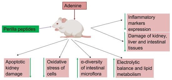Perilla peptides exhibit robust renal protective effects in adenine-induced renal injury models, addressing key aspects of kidney health including electrolyte balance, lipid metabolism, and osmolality regulation. Adenine administration disrupted electrolyte homeostasis, leading to significant deviations in serum levels of Ca2+, Mg2+, Cl−, Na+, and Pi, indicative of impaired kidney function. Treatment with perilla peptides effectively normalized these electrolyte imbalances, restoring Ca2+, Mg2+, Cl−, Na+, and Pi levels towards control values. Additionally, adenine exposure resulted in impaired kidney concentrating function, evident from reduced urinary osmolality and elevated serum osmolality. Treatment with perilla peptides restored urinary osmolality while decreasing serum osmolality, indicating enhanced renal tubular function and systemic osmotic balance regulation. Adenine treatment induced severe apoptotic damage in the kidneys of mice, as evidenced by reduced anti-apoptotic BCL2 expression and increased pro-apoptotic BAX and Caspase3 expressions. In contrast, high-dose perilla peptide intervention significantly enhanced BCL2 expression and decreased BAX and Caspase3 expressions, indicating the peptides’ potential in alleviating apoptotic kidney injury caused by adenine. Moreover, adenine-induced renal injury was associated with elevated serum levels of total cholesterol (T-CHO) and triglycerides (TG), characteristic of hyperlipidemia observed in chronic kidney disease (CKD) models. Perilla peptide intervention successfully reversed the heightened T-CHO and TG levels, highlighting their role in improving lipid metabolism and mitigating cardiovascular risk factors associated with kidney dysfunction [31]. These effects underscore the therapeutic potential of perilla peptides in mitigating renal damage and improving kidney function, emphasizing their multifaceted benefits in renal and systemic health management. Figure 5 illustrates the protective effects of perilla peptide against adenine-induced damage in mice, highlighting its role in delaying the progression of kidney damage. Perilla peptides reduce the expression of inflammatory markers, oxidative stress, and apoptotic kidney damage. They also improve histopathological outcomes. Additionally, these peptides enhance the expression of immunostimulatory cytokines, increase the α-diversity of intestinal microflora, maintain electrolytic balance, support lipid metabolism, and boost levels of antioxidant enzymes and proteins.