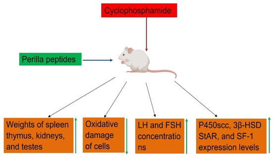 In rats subjected to cyclophosphamide-induced gonadotoxicity, a significant reduction in serum androgen levels, as well as a decrease in luteinizing hormone (LH) and follicle-stimulating hormone (FSH) concentrations, have been observed, indicative of disrupted endocrine function and impaired reproductive health. Cyclophosphamide, a potent chemotherapeutic agent, is known to induce these disturbances, affecting the biosynthesis and regulation of steroid hormones and reproductive hormones. However, a promising therapeutic intervention has emerged with the administration of perilla peptides. Supplementation with perilla peptides has demonstrated remarkable efficacy in restoring hormonal balance, as evidenced by a significant elevation in serum androgen levels and the restoration of LH and FSH to physiological concentrations (Figure 6). This indicates the potential of perilla peptides as a beneficial therapeutic strategy for preserving reproductive function and hormone homeostasis [83]. The observed restoration of hormonal balance underscores the significance of exploring natural peptide-based therapies in mitigating the endocrine disturbances associated with chemotherapy and improving overall reproductive health and quality of life. Further antioxidant activity and reverse of organ atrophy by perilla peptides mitigating the sexual dysfunction in rats injured with cyclophosphamide (Figure 6). This highlights the potential of perilla peptides as a promising therapeutic intervention to counteract the adverse effects of chemotherapy on reproductive endocrine function.