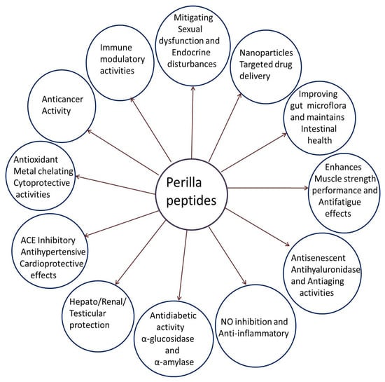 In summary PSM protein hydrolysates and peptides exhibit a wide range of beneficial health effects, including metal chelating, antioxidant, cytoprotective, anti-aging, anti-inflammatory, antidiabetic, antihypertensive, anticancer, anti-fatigue, intestinal health maintenance, immunomodulatory, hepatoprotective, renal protective, and testicular protective properties. Further perilla seed oligopeptides have been employed for targeted drug delivery systems. Different biological activities of perilla peptides are represented in Figure 7.
