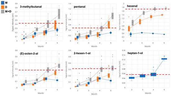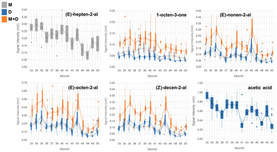 | (E)-nonen-2-al (M+D) | 1141 | - | 0.591 | *** | ↑ | −0.549 | *** | ↓ |