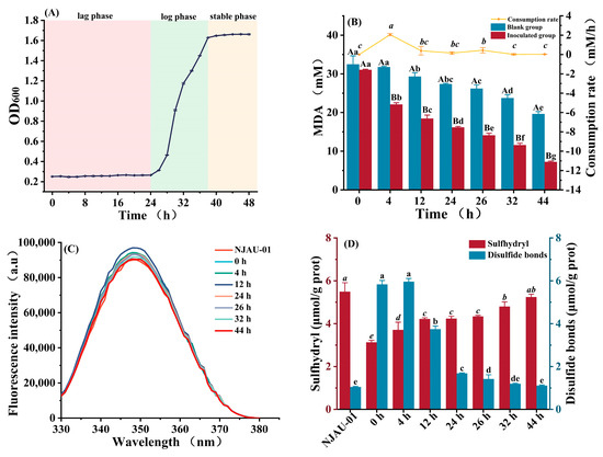 Growth curve of L. plantarum NJAU-01 in 300 mL MRS culture system with 40 mM MDA (A). Malondialdehyde content and consumption rate during kinetic growth of L. plantarum NJAU-01 (B). Schiff base content of L. plantarum NJAU-01 cell-free extract (C). Total thiol and disulfide bond content of L. plantarum NJAU-01 cell-free extract (D).