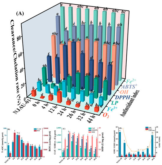 Changes in antioxidant indicators (O2−, Fe3+, LP, DPPH, OH, ABTS+, Fe2+) in vitro (A); T-AOC and ROS content (B); CAT, GSH-Px, and SOD activity (C); GSH, GSSG activity, and the ratio of CSH and GSSG of cell-free extract of L. plantarum NJAU-01 in 300 mL MRS culture system with 40 mM MDA (D). T-AOC: total antioxidant capacity; ROS: reactive oxygen species; CAT: catalase; SOD: superoxide dismutase; GSH-Px: glutathione peroxidase; GSH: reduced glutathione; GSSG: oxidized glutathione. NJAU-01: L. plantarum NJAU-01 under non-MDA stress. The different lowercase letters represent significant (p < 0.05) variations in each antioxidant activity between different time points.