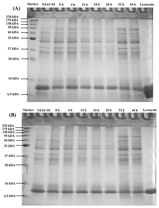 SDS-PAGE analysis demonstrated variations in the intensity of protein bands within cell-free extracts of NJAU-01 across different growth stages (Figure 3). Protein content notably decreased during incubation periods ranging from 12 h to 26 h. A high molecular weight polymer was observed at the top of the gel (270 to 130 kDA), reaching peak intensity at 4 h (Table 1) and then gradually diminishing and disappearing as incubation time extended. These observations suggested that NJAU-01 underwent dynamic protein upregulation and downregulation as they adapted to mitigate MDA stress. By comparing Figure 3A and Figure 3B, it is evident that an aggregation occurs in the band above 130 kDA; the group lacking mercaptoethanol exhibited a higher band intensity compared to the group containing mercaptoethanol. This can potentially be attributed to cross-linking induced by an increase in disulfide bonds. This observation aligns with the findings reported by Chen et al. [15].