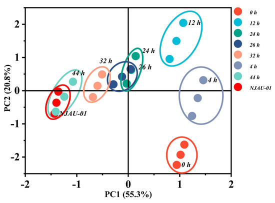 The two main components accounted for 55.3% and 20.8% of total variation in PCA, respectively (Figure 4). The samples of 44 h and non-MDA treated NJAU-01 were located on the same side of the vertical axis, which are clearly separated from the other samples. Moreover, the samples at 0 h, 4 h, 12 h, 24 h, 26 h, and 32 h were distributed in the first, second, and third quadrants, respectively. The responses of MDA-stressed NJAU-01 on protein oxidation, in vitro antioxidant capacity, and antioxidant enzyme activity indicators throughout the growth stage were presented as a circular rotation on the PCA plot.