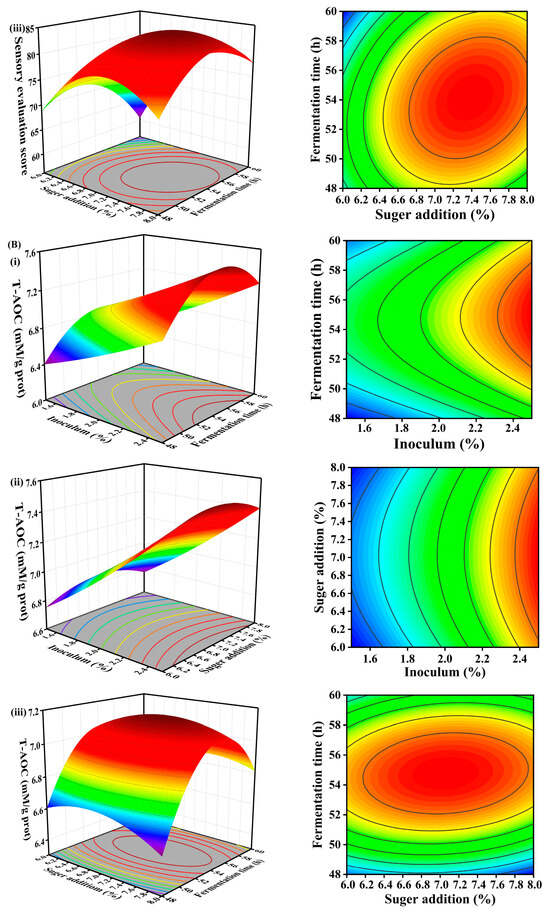Building upon the results of previous single-factor experiments, in conjunction with the response surface design scheme and the comprehensive fuzzy mathematical model, inoculum, fermentation time, and sugar addition were identified as the three critical factors. Sensory evaluation and total antioxidant capacity (T-AOC) were utilized as response variables. The refined NJAU-01 lactic acid beverage will be utilized for subsequent experimental assessments.