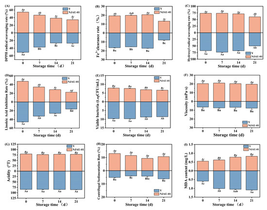 A previous study discovered a decline in viability of Lactobacillus acidophilus in yogurt during storage, which was accompanied by a reduction in DPPH scavenging activity after 14 days [12]. Our previous study has proved that Lactiplantibacillus plantarum NJAU-01 indicated capabilities of acid production [13], antioxidation [14,15,16], and regulation of intestinal microbiota [17], but the storage stability of lactic acid beverages supplemented with NJAU-01 has not been extensively studied.