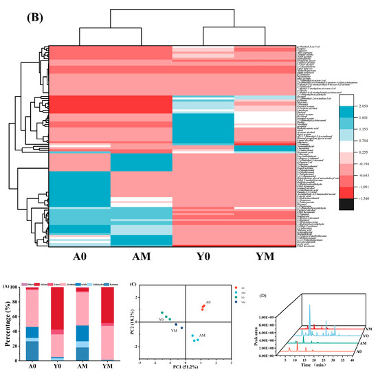 All analytical tests were carried out in triplicate. The results were statistically analyzed by one-way ANOVA, and comparison of the mean values was performed by Duncan’s test using SPSS 21. Principal component analysis (PCA) was performed using the statistical software SIMCA 14.1 (MKS Instruments AB Inc., Malmo, Sweden). The MDA scavenging ability, oxidative stress indices, and antioxidant parameters of NJAU-01 at various growth stages were considered as variables in the NJAU-01 experiment. The types and contents of all volatile compounds were utilized as variables in the beverage experiments. The plots were generated using Origin 2021 pro. Significance was considered at p < 0.05.