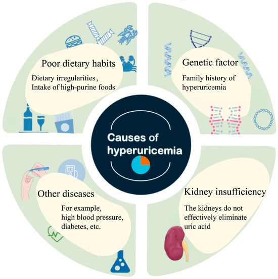 The recent, rising global prevalence of HUA has triggered accompanying increases in not only gout but also the onset and progression of various associated systemic diseases, including renal disorders, metabolic syndrome, cardiovascular diseases, and cerebrovascular diseases. The accumulation of UA in the body occurs primarily through two mechanisms: the overproduction of UA (10% of cases) and insufficient excretion of UA (90% of cases) [22]. Factors such as an unhealthy diet and lifestyle, enzyme dysfunction in purine metabolism, renal disease, and certain pharmacological interventions can lead to excessive serum uric acid (SUA) levels, triggering HUA, as illustrated in Figure 1.