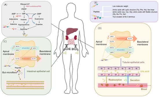 Uric acid-lowering mechanism of food-derived peptides. (A) Uric acid synthesis process and the role of peptides. (B) Structural features of characteristic bioactive food-derived peptides. (C) Uric acid excretion process in the intestine, transport proteins in intestinal epithelial cells, and the role of peptides. (D) Uric acid excretion process in the kidneys, transport proteins in renal epithelial cells, and the role of peptides.