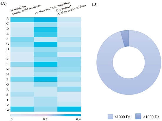 (A) Composition of amino acid residues in food-derived UA-lowering peptides and (B) percentage of low-molecular-weight peptides.
