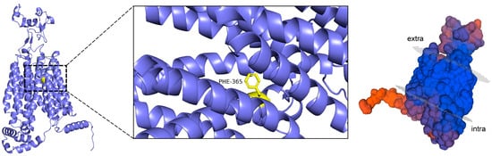 Peptide molecules can hinder the binding of UA to transporter proteins by occupying key binding sites through spatial site blocking, and their flexible structures facilitate access to these binding cavities. Spatial site blocking is, therefore, an effective strategy for URAT1 inhibition, achieved either by interfering with the binding of UA to URAT1 or by inducing conformational changes in URAT1. A variety of small-molecule inhibitors have been developed to modulate the functions of URAT1, GLUT9, and ABCG2 by binding to the core of these transport proteins and spatially obstructing the transport of UA through the substrate channel. Verinurad, for instance, specifically inhibits hURAT1 by occupying key residues in the substrate channel, namely, Cys-32, Ser-35, Phe-365, Met-25, and Ile-481, and effectively reducing URAT1 transport [78]. Similarly, Tan et al. found that this inhibitor exerts its effects by targeting three binding sites (Ser-35, Phe-365, and Ile-481) in hURAT1 [83]. Phe-365 is particularly critical in the active pocket of transporter proteins [83,84], as can be seen in Figure 4.