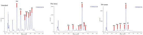 HPLC profile of the monosaccharide composition of the polysaccharides following hydrolysis and derivatization. Standard monosaccharides, Pbs larva, and Bm pupa monosaccharides. Mannose (Man), rhamnose (Rha), glucuronic acid (GlcA), galacturonic acid (GalA), glucose (Glc), galactose (Gal), and arabinose (Ara).