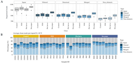 The study protocol was approved by the Institutional Animal Care and Use Committee (IACUC) of the National Institute of Agricultural Sciences (NAS-202302). Seven-week-old female C57BL/6J mice, weighing 20–25 g, were procured from Central Lab. Animal Inc. (Seoul, Republic of Korea) and acclimated to a temperature of 22 ± 2 °C, a humidity of 40 ± 5%, and 12 h light–dark cycle conditions for one week. They were then fed a standard diet (Purina, Co., LTD, Seongnam, Republic of Korea) that contained 20% crude protein, 4.5% crude fat, 6% crude fiber, 7% crude ash, 0.5% calcium, and 1% phosphorus and sterilized water ad libitum for a week as an adaptation period. The mice were subsequently divided into four groups (n = 8) as follows: control (phosphate buffer saline (PBS), FOS (50 mg/kg), Pbs larva PS (50 mg/kg), and Bm pupa PS (50 mg/kg); eight mice were included in each cage, and the groups were housed in separate cages. The mice were administered FOS, Pbs larva PS, and Bm pupa PS intragastrically at doses of 50 mg/kg/day, respectively. The control and treatment groups were treated with the same volume of PBS. The control ingested 100 microliters of PBS via oral administration. All mice received a standard diet (Purina, Co., LTD, Seongnam, Republic of Korea) and tap water ad libitum for 6 weeks. Body weight was measured every 2 days during the feeding period. For six weeks, the mice were given free access to food and water. The mice were sacrificed at the end time point (six weeks, n = 8 each) via CO2 asphyxiation. The average weights of the mice at the sacrifice times were 28.20 ± 0.48 g (p > 0.05). After dissection, the colons were collected for microbial analysis. Thirty-two colon samples were used for the gut microbiota analysis, and each sample was chosen based on the average weight on the sacrifice week. All colon samples were prepared for NGS analysis. The tissue and stool samples were immediately frozen at −80 °C in a deep freezer after collection.