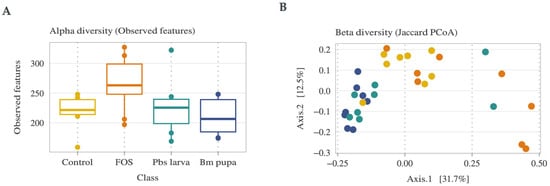 Diversity of sequenced samples: (A) alpha diversity calculated from observed features; (B) beta diversity calculated from the Jaccard PCoA.