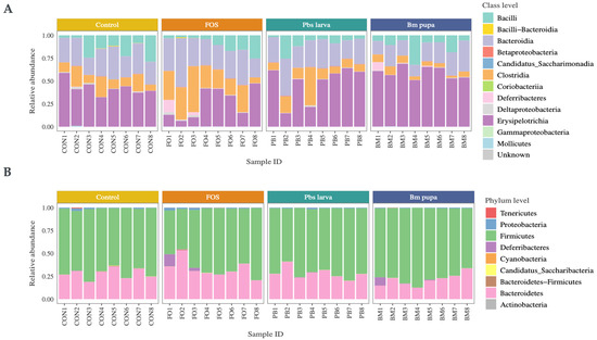 The process for sequencing the mouse gut microbiota is shown in Figure 2, and the corresponding values are given in Supplementary Table S1. In total, four groups of mice were sequenced using 16s rRNA sequencing to explore the gut microbiota changes that occurred when administering two different insect polysaccharides, i.e., Pbs larva (Protaetia brevitarsis seulensis larva) and Bm pupa (Bombyx mori pupa), along with FOS (fracto-oligosaccharide) and phosphate-buffered saline (PBS) as the positive and negative controls, respectively. In total, the gut microbiota of 32 mice were sequenced, with each group comprising 8 mice (Figure 2A). A total of 1 GB of sequences was obtained, with an average of 80,000 reads of sequences extracted from all samples. After processing the sequence artifacts until the chimeric reads, as illustrated in Figure 2B, 48.7% of the sequences remained. These processed sequences were subjected to taxonomic annotation, resulting in 969 operational taxonomic units (OTUs) with 567 genera and 470 species. The alpha-diversity, computed using the observed OTUs, revealed that the FOS group contributed to a greater bacterial population than the other groups (Figure 3A). The beta-diversity of the samples, which measured the diversity of observed OTUs with Jaccard PCoA between groups of samples, is illustrated in Figure 3B, demonstrating that the insect polysaccharide-administered samples and the positive control were distinct, while the FOS partially overlapped with the negative control and treatments. Among these, the Erysipelotrichia class of bacteria was abundant in all the samples (Figure 4A). At the phylum level, Bacteroidetes and Firmicutes accounted for approximately 90% of the sequences (Figure 4B).