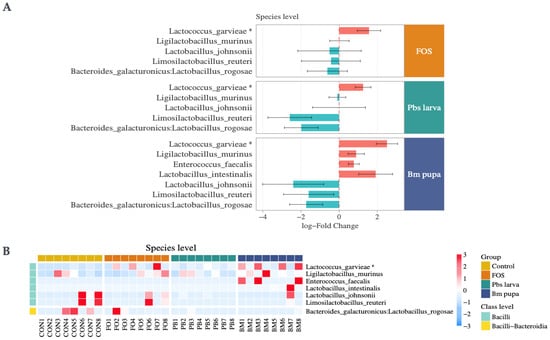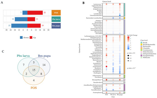 According to Lin and Peddada [33], it is essential to exercise caution when addressing normalization and differential abundance in metagenomic sequencing. The ANACOM-BC method was employed for differential abundance analysis to better understand the differences between the negative control and the other three groups. In total, we identified 55 bacteria at the genus level that were differentially abundant in all three groups compared with the control (i.e., negative control); thus, the mice were only treated with PBS. This group included OTUs for 65 species, for which the expression values are illustrated in Supplementary Figure S1. The detailed differential abundances of each group in both directions (i.e., up and down) are illustrated in Figure 5A. In total, 29 bacterial genera from FOS, 29 from Pbs larva, and 42 from Bm pupa were significantly differentially abundant (Figure 5A,B). Among those, 15 bacterial genera were differentially abundant in all three groups (Figure 5C). Furthermore, we explored the beneficial microbial, i.e., probiotic differential abundances, for the same species at the species level (Figure 6). Overall, Lactococcus garvieae (q-value ≤ 0.5) was significantly enriched in all three diets, i.e., FOS, Pbs larva, and Bm pupa (Figure 5A and Figure 6A,B). Lactobacillus johnsonii, Limosilactobacillus reuteri, and Lactobacillus rogosae were depleted all three groups compared to the negative control (Figure 5B and Figure 6A,B). Ligilactobacillus murinus, Enterococcus faecalis, and Lactobacillus intestinalis were enriched in the Bm pupa compared to negative control but not in other groups (Figure 6A).