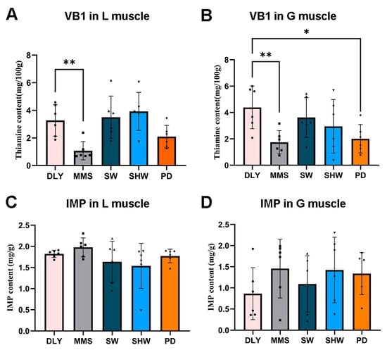VB1 and IMP content in the L and G muscle among pig breeds. “*” indicates that the p-value < 0.05 and “**” indicates that the p-value < 0.01.
