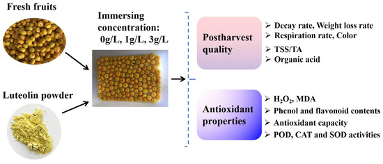 - Liu, X.Y.; Cui, X.M.; Ji, D.C.; Zhang, Z.Q.; Li, B.Q.; Xu, Y.; Chen, T.; Tian, S.P. Luteolin-induced activation of the phenylpropanoid metabolic pathway contributes to quality maintenance and disease resistance of sweet cherry. Food Chem. 2021, 342, 128309. [Google Scholar] [CrossRef] [PubMed]